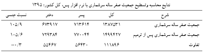 بررسي سوابق سرشماري هاي نفوس در اغلب كشورهاي جهان از جمله در ايران نشان مي دهد كه همواره پوشش جمعيت و شمارش دقيق آن از اولين سرشماري تاكنون، از مهمترين دغدغه هاي طراحان و برنامه ريزان سرشماري هاي عمومي نفوس و مسكن كشور بوده است. اما با وجود تدابيري كه در اين زمينه انديشيده مي شود، خطا در گزارش سن و جنس اتفاق مي افتد. لذا محققان به منظور بررسي مقدار خطا و درصورت نياز تسطیح آنها، روش هاي مختلفي براي ارزيابي و در صورت لزوم هموارسازی داده ها ارائه داده اند. از جمله خطاي رايج در شمارش جمعيت، احتمال كم پوششي جمعيت صفرساله است كه در نتايج سرشماري كشورهاي مختلف جهان رایج است. اين مختصر با توجه به اهمیت پوشش جمعیت صفر ساله سرشماری در مطالعات و شاخص های مختلف جمعیتی، به ارزيابي و بررسی پوشش جمعیت صفرساله در سرشماری عمومی نفوس و مسکن 1395 و نيز اثر طولاني شدن مدت اجرا سرشماري بر مقدار كم پوششي جمعيت صفرساله پرداخته و سپس راه کارهايي جهت تسطیح آن ارائه مي نماید.