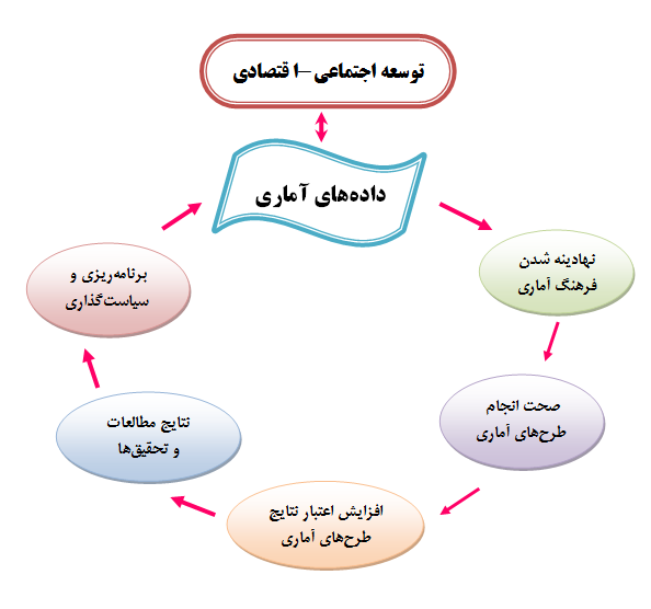 توضيح آنكه دستيابي به توسعهی اجتماعي – اقتصادي زماني محقق خواهد شد كه در جامعه فرهنگ آماري نهادينه شود، به گونه اي كه آحاد جامعه و تك تك افراد جمعيت نسبت به اطلاعاتي كه در اختيار آمارگيران و شاغلين اين امر قرار مي دهند، احساس مسئوليت نموده و با آگاهي به اينكه نتايج پاسخهاي آنان در نهايت در جهت بهروزي و سعادت آنان بهره گرفته خواهدشد، با دقت و صحت به فرمهاي مربوطه پاسخ دهند، به اين ترتيب بر اعتبار و اطمينان داده هاي آماري افزوده مي شود و سپس نتايج يافته هاي طرح هاي آماري با دقت بالا در اختيار برنامه ريزان قرار گرفته و برنامه ريزان و سياستگذاران ميتوانند برنامه هاي دقيق و درستي را براي كشور ارائه و افراد جمعيت (پاسخگويان طرحهاي آماري) از نتايج آن سود ببرند. در واقع يك گردش تسلسل وار بين مراحل مذكور وجود دارد. همانطور كه نمودار زير نشان مي دهد اين حركت از داده هاي آماري آغاز شده و دوباره به داده هاي آماري باز ميگردد.