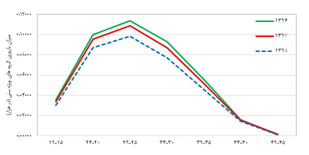 الگوي سني باروري در ايران نشان دهنده كاهش ميزان باروري در همه سنين از جمله گروه هاي سني 20-24 و 25-29 و 30-34 ساله از سال 1396 تا 1398 است. اين تغيير بيانگر كاهش باروري به ويژه در ميان گروه سني جوان است كه به نوبه خود سهم بسزايي در كاهش ميزان باروري كشور داشته است. اين موضوع اهميت باروري زنان در گروه هاي سني مورد بحث را نشان مي دهد و لازم است بيش از پيش در سياستگذاري و برنامه ريزي هاي جمعيتي مورد توجه قرار گيرد.