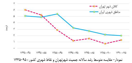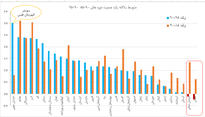 نمودار 3 –مقايسه نتايج متوسط رشد سالانه جمعيت پيش بيني شده قبلي و بازنگري شده، كل كشور از سال 1395 تا 1430
