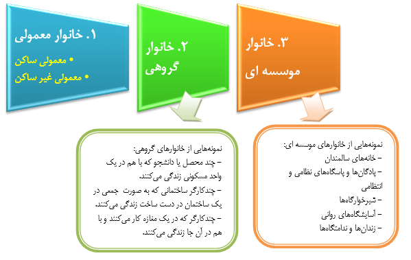 - خانوار معمولي: از چند نفر تشكيل مي شود كه با هم در يك اقامتگاه زندگي مي كنند، با يكديگر هم خرج هستند و معمولا با هم غذا مي خورند. در مواردي خانوار معمولي مي تواند يك نفره باشد. خانوارهاي معمولي از نظر وضع سكونت به دو دستهي ساكن و غيرساكن تقسيم ميشوند: