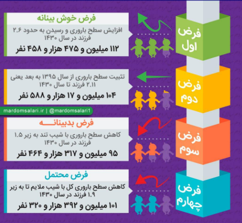 مطالعات جمعیت در سال 1395 نشان میدهد که میزان باروری در ایران در سطح جانشینی بوده که البته این میزان یک حالت مقطعی و گذار بوده است و با یک شیب ملایم رو به کاهش قرار دارد. بنده با توجه به شرایطی که ایران دارد، فرض محتمل را باروری 9/1 در نظر گرفتم که بر اساس آن جمعیت ایران به احتمال زیاد در سال 1430، بالغ بر ۱۰۱ میلیون نفر میشود. در سناریوی خوشبینانه، با در نظر گرفتن باروری 6/2 فرزند، جمعیت کشور، حداکثر به ۱۱۲ میلیون نفر میرسد که البته این فرض خیلی ضعیف بوده و احتمالش خیلی پایین است و در حالت بدبینانه، با سطح باروری 5/1 فرزند، جمعیت ایران در سال 1430 بالغ بر ۹۵ میلیون نفر خواهد بود. به هر حال هر کدام از این چهار سناریو را در نظر بگیریم، تا سال ۱۴۳۰ ما رشد منفی جمعیت را تجربه نخواهیم کرد. شايان ذكر است نمي توان گفت هميشه پيش بيني هاي جمعيت حتما به وقوع مي پيوندند و قطعيت دارند. همانگونه كه ذكر شد مجددا در سال هاي آتي با توجه به شرايط جديد لازم است بازنگري شوند.